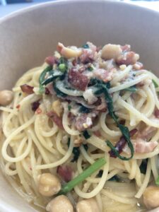 B.春菊とひよこ豆 ベーコンのペペロンチーノ スパゲティ