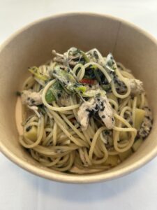 B.長ネギと鶏むね肉 胡麻のペペロンチーノ スパゲティ